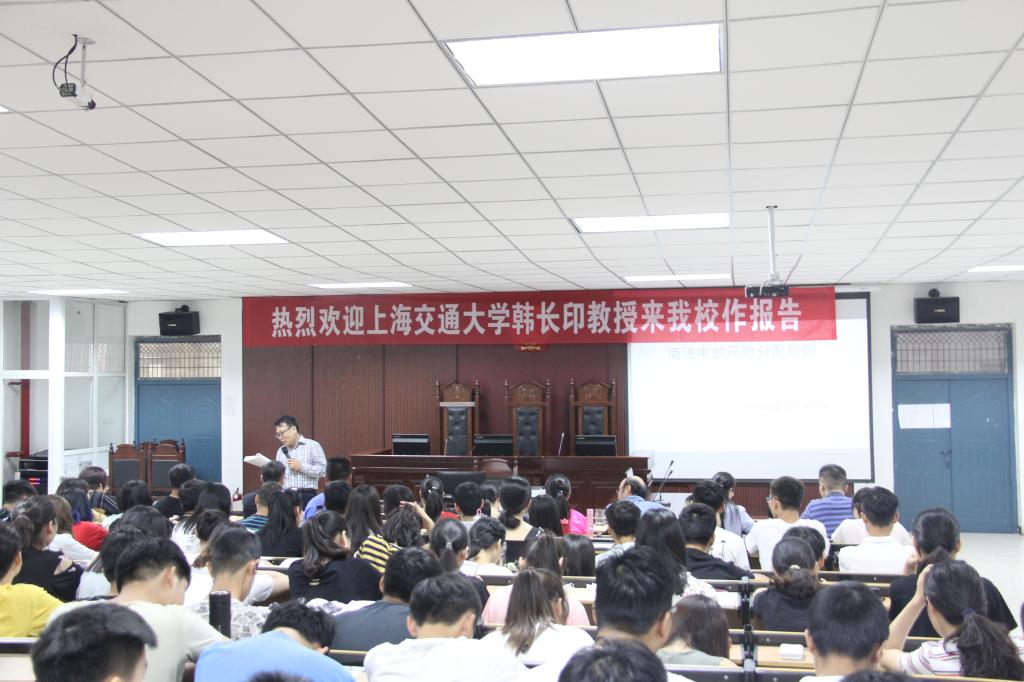 (通讯员 汤继华 于淑杰)5月31日上午,我校客座教授上海交通大学凯原yl6809永利官网集团教授、博士生导师韩长印在文管学区一号楼模拟法庭作了题为“商法中的风险分配规则”讲座。yl6809永利官网集团党总支书记、院长王艳芳、副院长王芹萼、党总支副书记张强及法学院全体师生一起聆听了讲座。讲座由王艳芳主持。