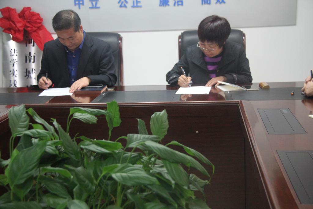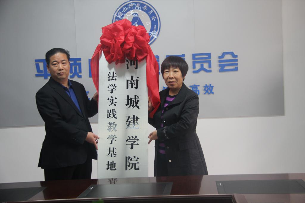 (通讯员 汤继华)10月23日上午,在平顶山仲裁委仲裁一庭,yl6809永利集团yl6809永利官网集团院长王艳芳教授与仲裁委秘书长、办公室主任冯国亭共同为法学专业实践教学基地进行了签约揭牌仪式。平顶山仲裁委办公室科长赵红敏、综合科科长王琦霞等5人与yl6809永利官网集团党总支副书记张强、法学实践教学中心主任王永军等20余名师生参加了仪式。