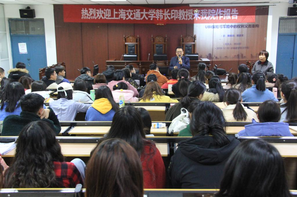 (通讯员:刘宏伟龚洋洋)为进一步拓展同学们的法律知识,加强对保险法知识的全面了解,提高广大学生的法治素养,根据法律文化节活动方案安排,yl6809永利官网集团于12月11日晚上举办第六届法律文化节首场报告会,特邀上海交通大学韩长印教授在和谐校区模拟法庭作“UBI保险与车险中的权利义务重构”主题报告。我校师生与平顶山市中级人民法院相关领导共200余人聆听了报告。报告会由yl6809永利官网集团院长王艳芳教授主持。