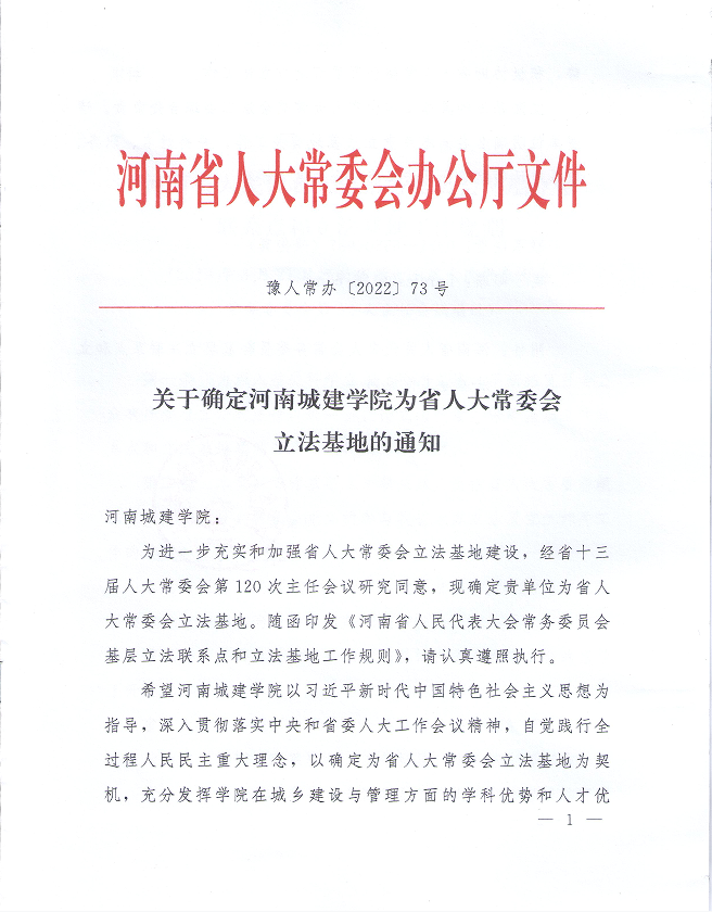 为进一步充实和加强省人大常委会立法基地建设,经河南省第十三届人大常委会第120次主任会议研究同意,确定我校为河南省人大常委会立法基地。