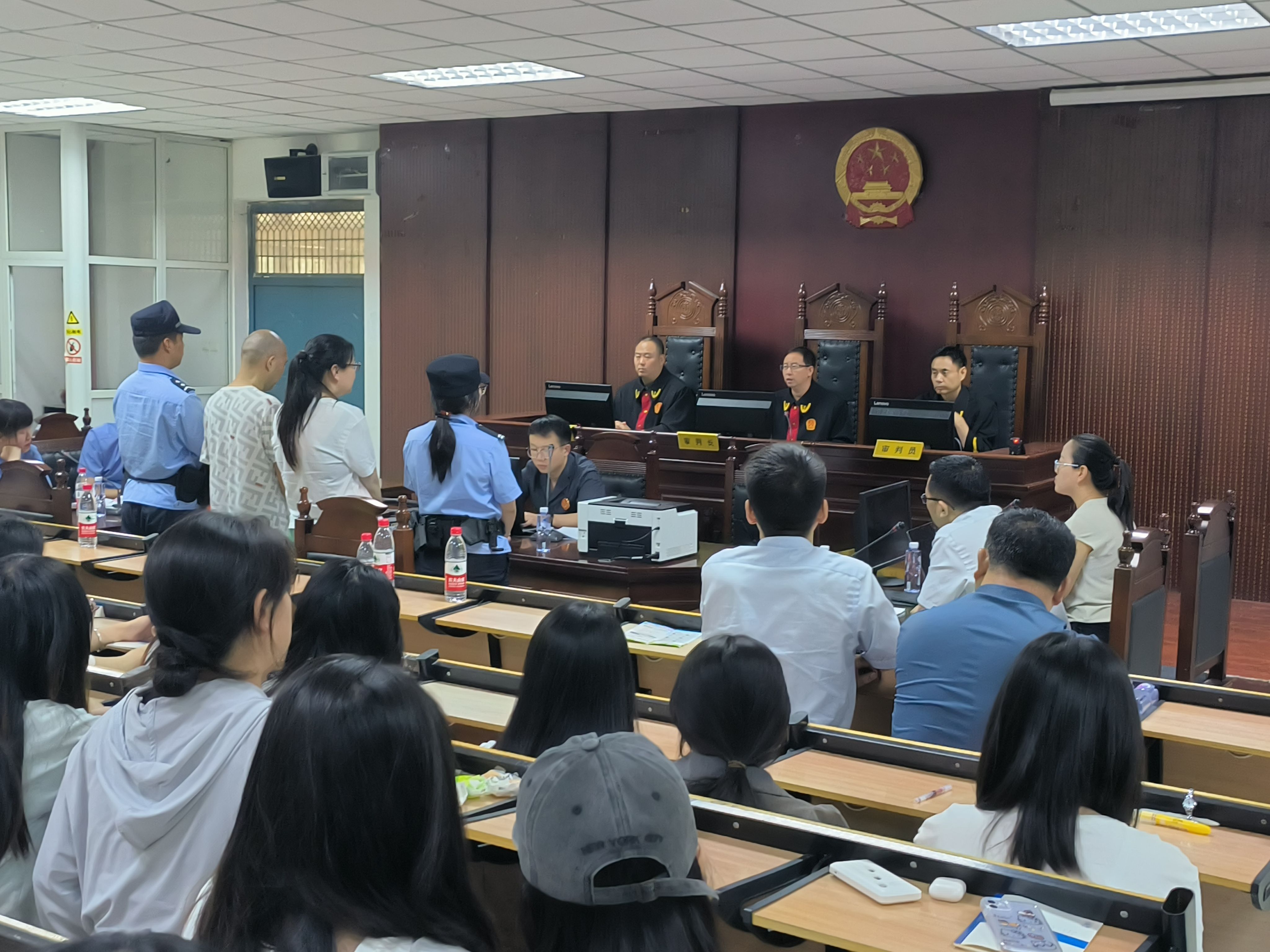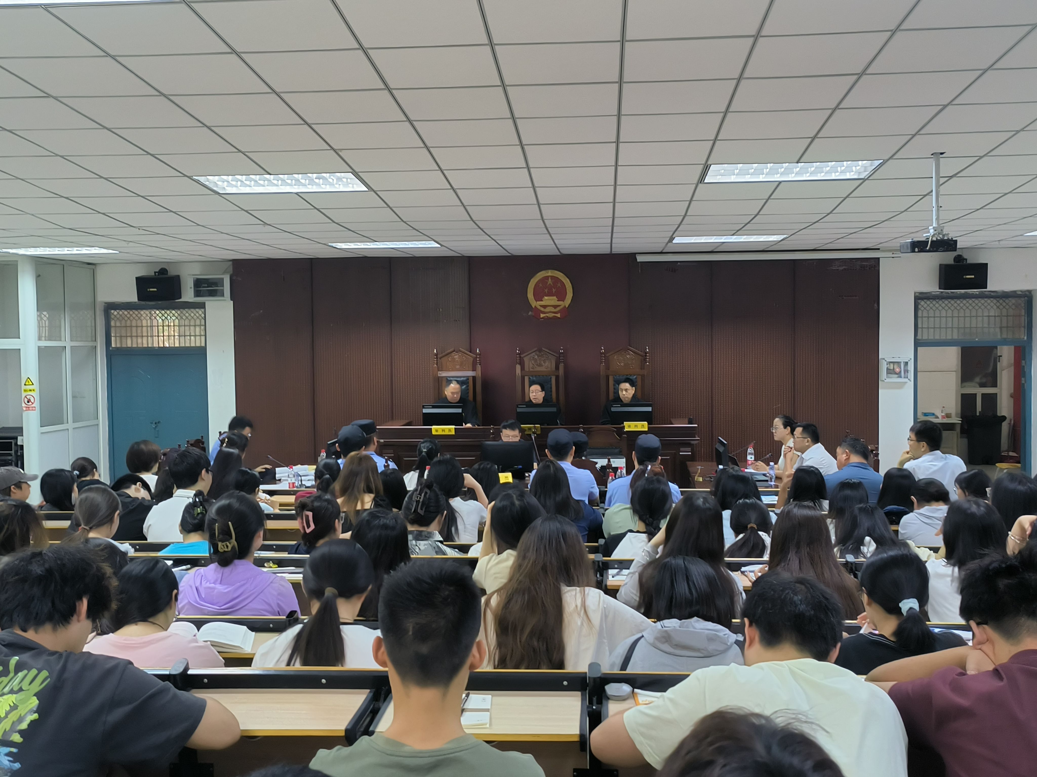 6月27日上午,我校又与平顶山市中级人民法院联合开展了“庭审进校园”活动,市中院在我校模拟法庭公开审理了郭某某等侵犯公民个人信息案。在市中院刑二庭庭长宋红超、副庭长张顺强、张文钦组成合议庭的主持下,有序把握庭审节奏,准确归纳争议焦点,严格遵循法定程序,适时引导控辩双方展开举证质证和辩论陈述;被告人及辩护人充分表达了辩护意见,整个庭审过程规范有序,庄严肃穆,严谨高效,为师生呈现了一场完整、精彩的刑事庭审,彰显了司法的公正权威。