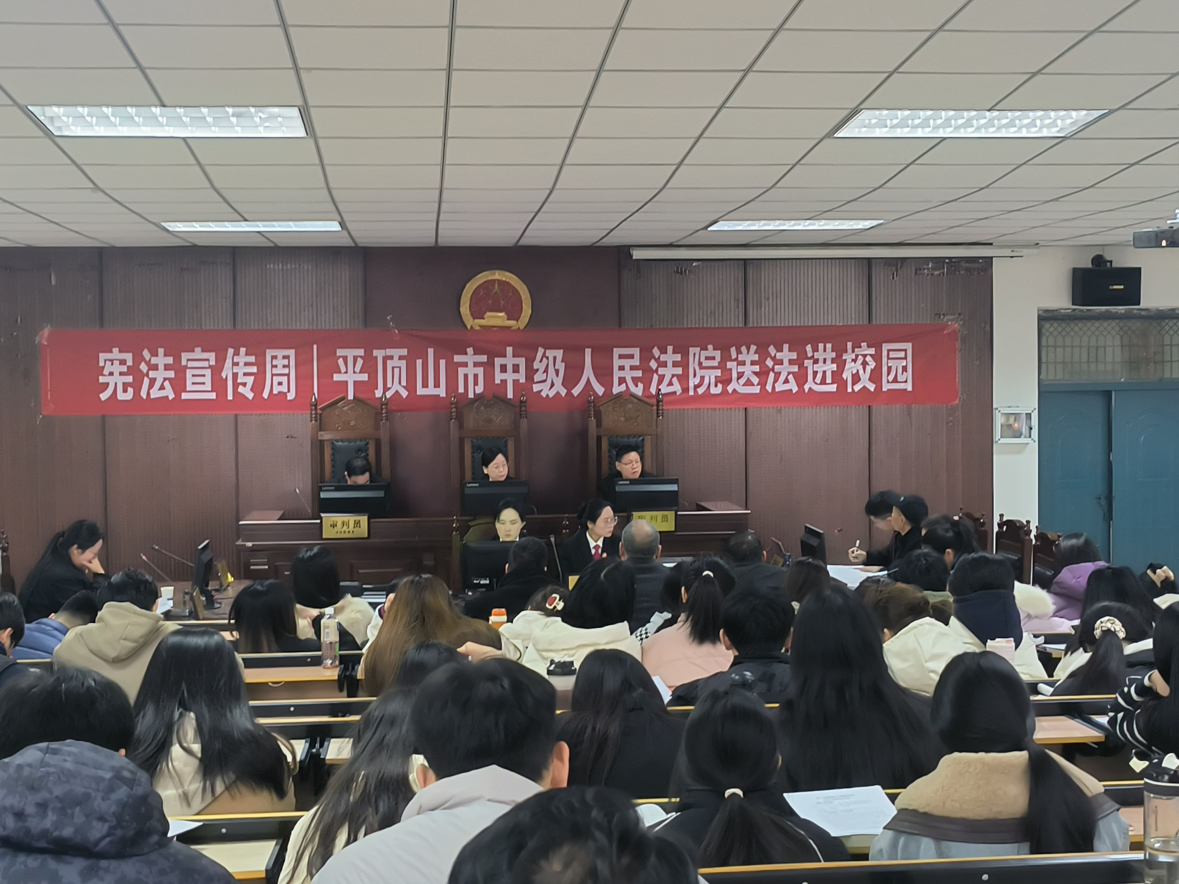 为扎实开展第七个“宪法宣传周”与学校第十一个“法律文化节”活动,弘扬宪法精神,维护宪法权威,推动宪法全面贯彻实施,进一步全面深化改革、推进中国式现代化营造良好法治环境,12月5日上午,我校与平顶山市中级人民法院联合举办“庭审进校园”活动。平顶山市中级人民法院民一庭杜军伟庭长亲自带队,由副庭长韦艳歌、员额法官陈西斌、梁东组成的合议庭在和谐校区yl6809永利官网集团模拟法庭开庭审理了一起机动车交通事故责任纠纷案件,200余名师生参加了旁听,庭审持续两个多小时。