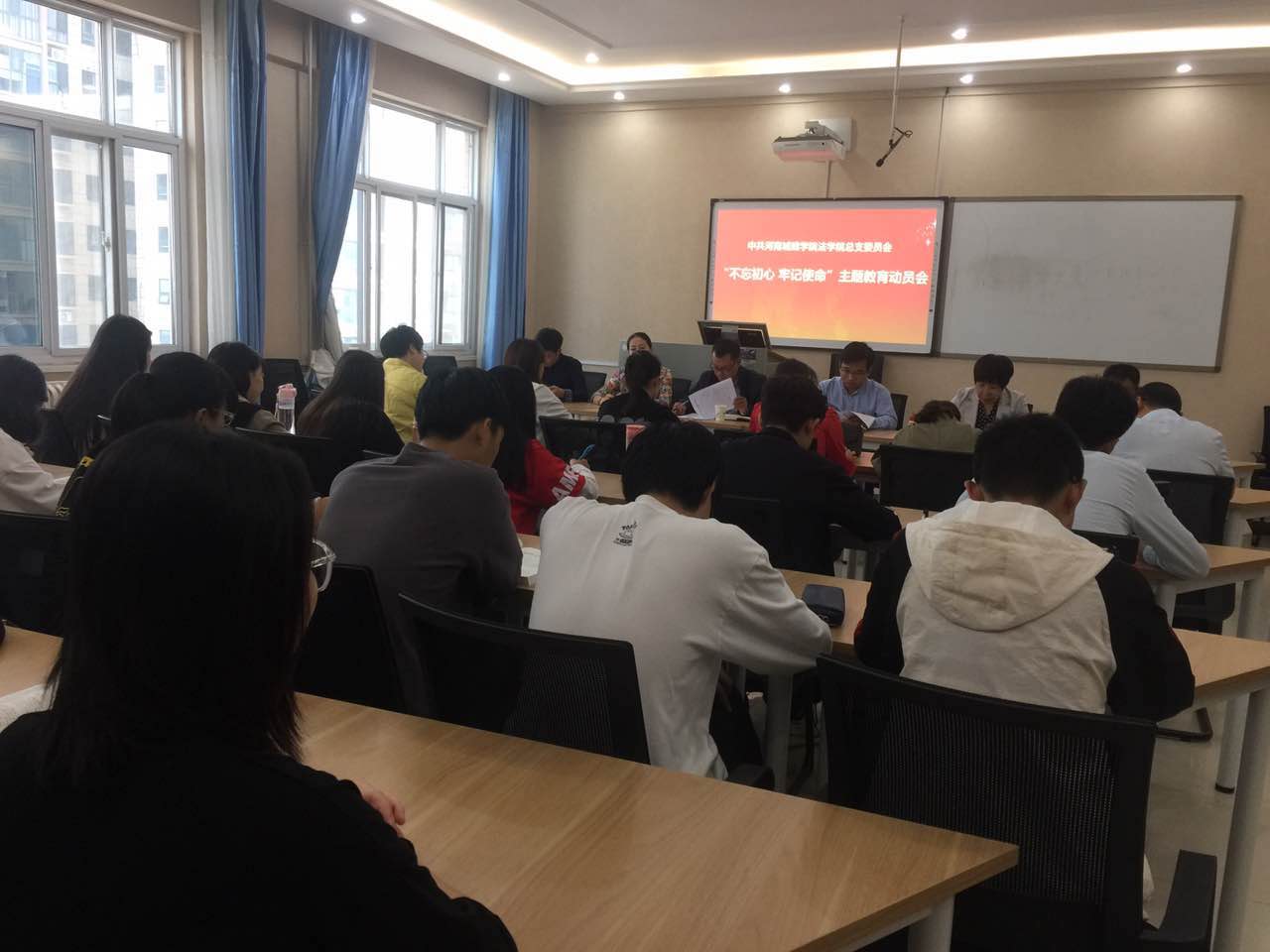 会议在庄严的国歌后开始。院党总支书记尹振羽在主题教育动员讲话中指出,“不忘初心、牢记使命”主题教育是全党一项重大政治任务,全体党员同志要充分认识到开展主题教育的重大意义,进一步明确主题教育的工作任务和总体要求,认真贯彻落实校党委书记张惠珍的动员讲话精神,扎实开展主题教育,严格落实主题教育活动四项制度,担当尽责推动学院主题教育活动取得实效。