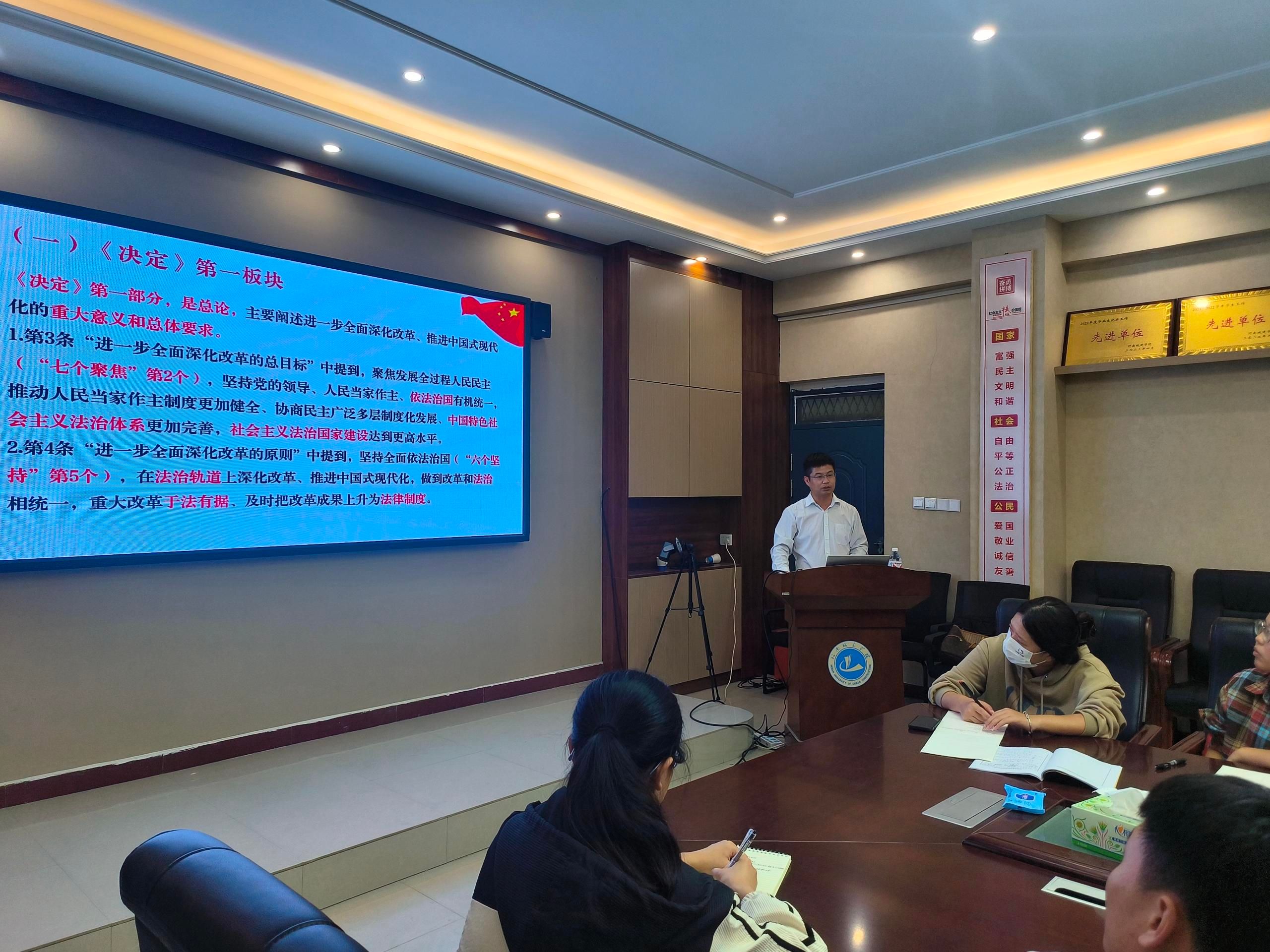 苗道华以“党的二十届三中全会《决定》中的‘法治’元素”为题,介绍了党的二十届三中全会的召开盛况,解读了二十届三中全会的主要内容,重点分析了《中共中央关于进一步全面深化改革、推进中国式现代化的决定》(以下简称《决定》)中的“法治”元素,并结合yl6809永利官网集团实际情况,就如何学习宣传贯彻好《决定》,谈了自己的认识和思考。报告主题鲜明、逻辑清晰,重点突出、分析细致,深入浅出、通俗易懂。
