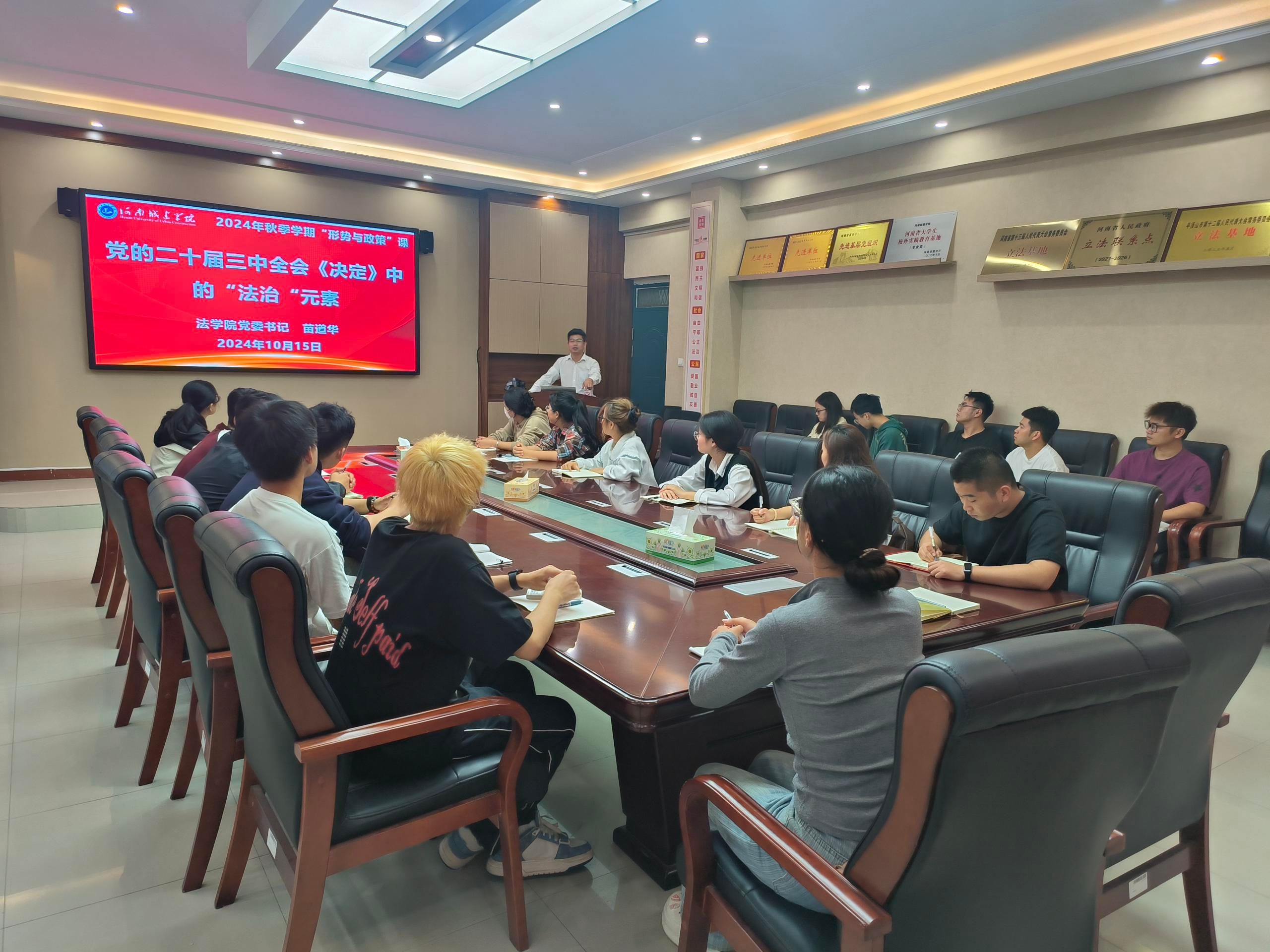 为深入贯彻落实党的二十届三中全会精神,10月15日下午,yl6809永利官网集团党委书记苗道华在美荟楼422为学院师生代表上形势与政策课。
