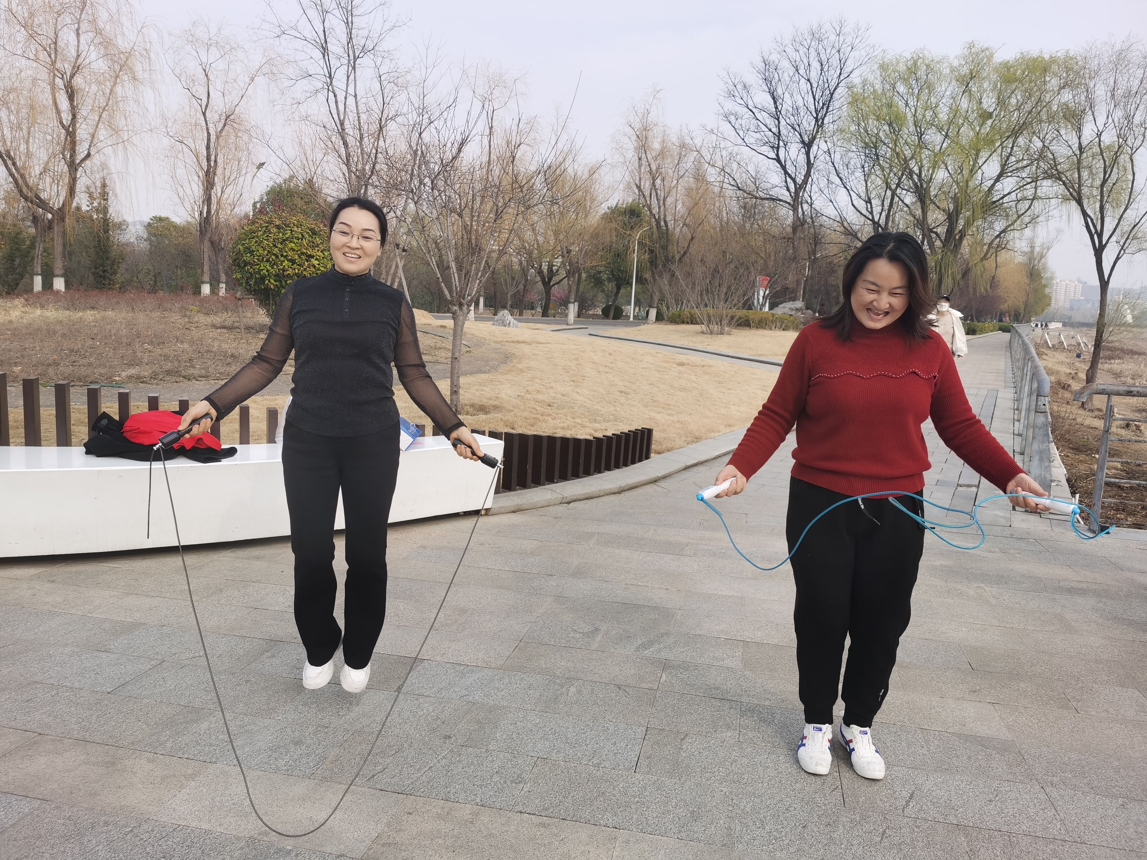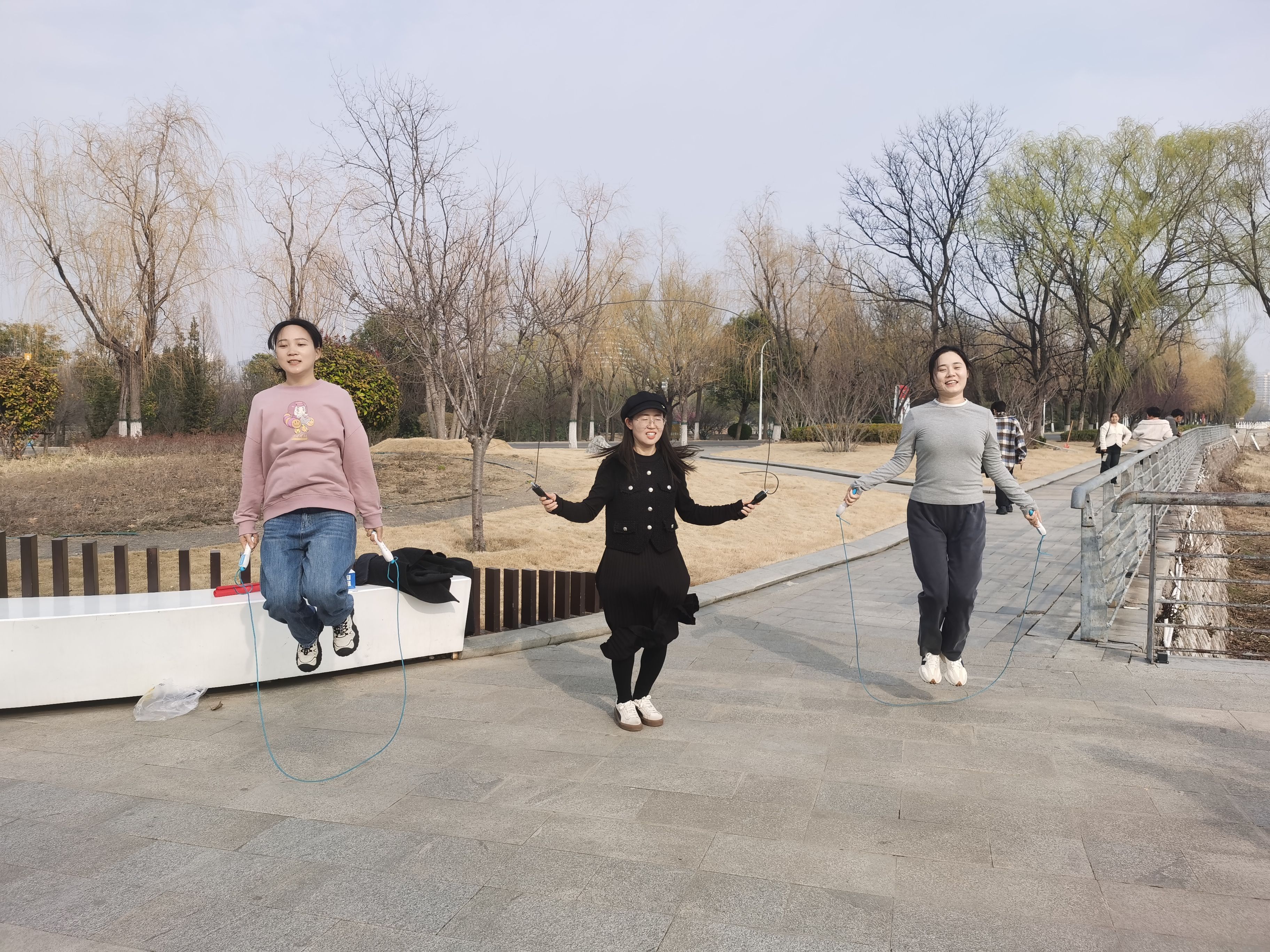 健步环节后,湖畔亭子旁边广场上的踢毽子和跳绳比赛将活动推向了高潮。参与踢毽子的女老师们身手敏捷,五彩的毽子在她们的脚尖灵活翻飞,引得周围观赛的同事们掌声、喝彩声不断。跳绳区域同样热闹非凡,女老师们快速挥动跳绳,跳绳与地面碰撞发出富有节奏的声响,无不展示出她们良好的身体素质与蓬勃朝气。