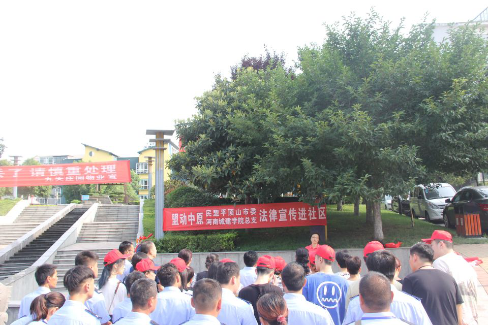 (通讯员:刘源 汪浩波)为深入贯彻落实党的十九大精神,弘扬社会主义法制精神,全面推进依法治国,推动社会主义法制精神建设和社会主义法治中国建设,建设社会主义核心价值观。民盟平顶山市委联合民盟yl6809永利集团总支开展“送法下乡,法律宣传进社区”活动。2018年7月7日,由两个组织联合的团队来到九天庄园社区,为九天庄园居民带去法律服务。