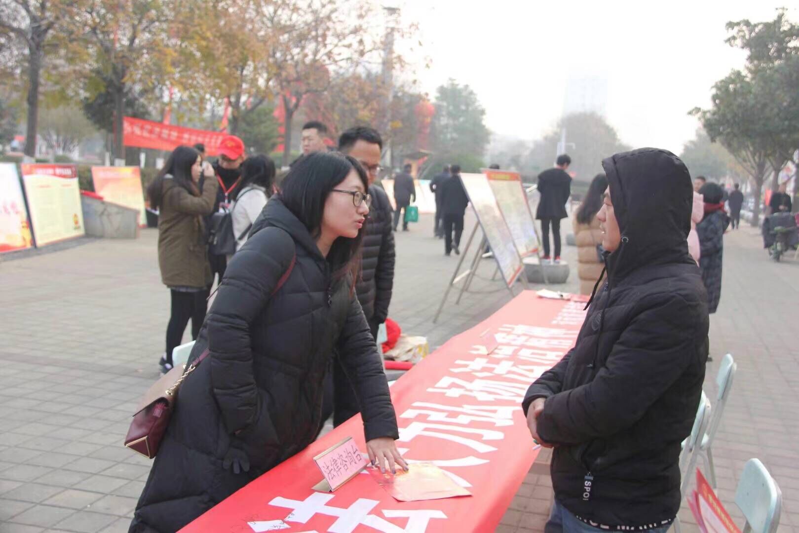 活动现场重点宣传党的十九大精神学习,宣传习近平新时代中国特色社会主义思想法治内涵;号召广大同学和人民群众深入学习宪法,增强宪法观念,弘扬宪法精神;广泛宣传中国特色社会主义法律体系;全面落实“七五”普法要求。采取了悬挂横幅、发放宣传资料、设立律师咨询台、摆放宪法宣传版面及普法签名相结合的形式。在校外宣传点鹰城广场,平顶山市委常委、政法委书记黄庚倜,平顶山市人大常委会副主任张荣海也郑重得在我们的宣传条幅上签名。