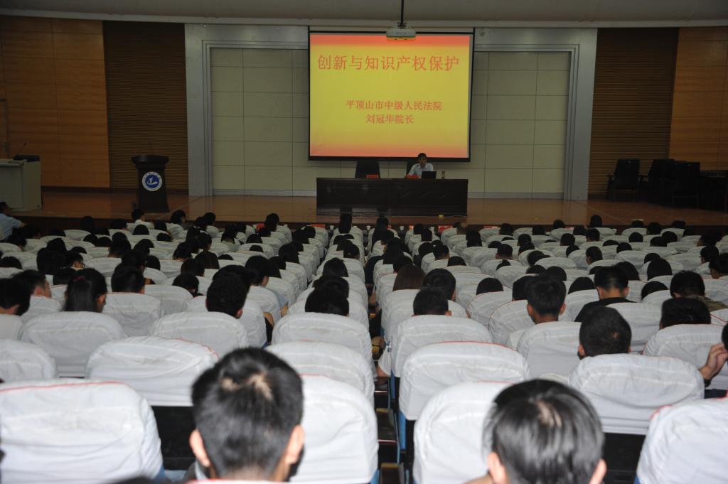 (通讯员 苏芸芳)6月20日下午,平顶山市中级人民法院院长刘冠华应邀参加我校第四届法律文化节闭幕式,并为我校师生作了题为《创新与知识产权保护》的报告。报告会在校行政楼学术报告厅举行,校党委副书记张坤书、副校长梁再培出席报告会,党委宣传部、学工部,人事处、科研(社科)处负责人,部分学院党总支书记、副书记,学工办主任,yl6809永利官网集团全体师生及其他学院师生代表500余人聆听了报告。报告会由张坤书主持。