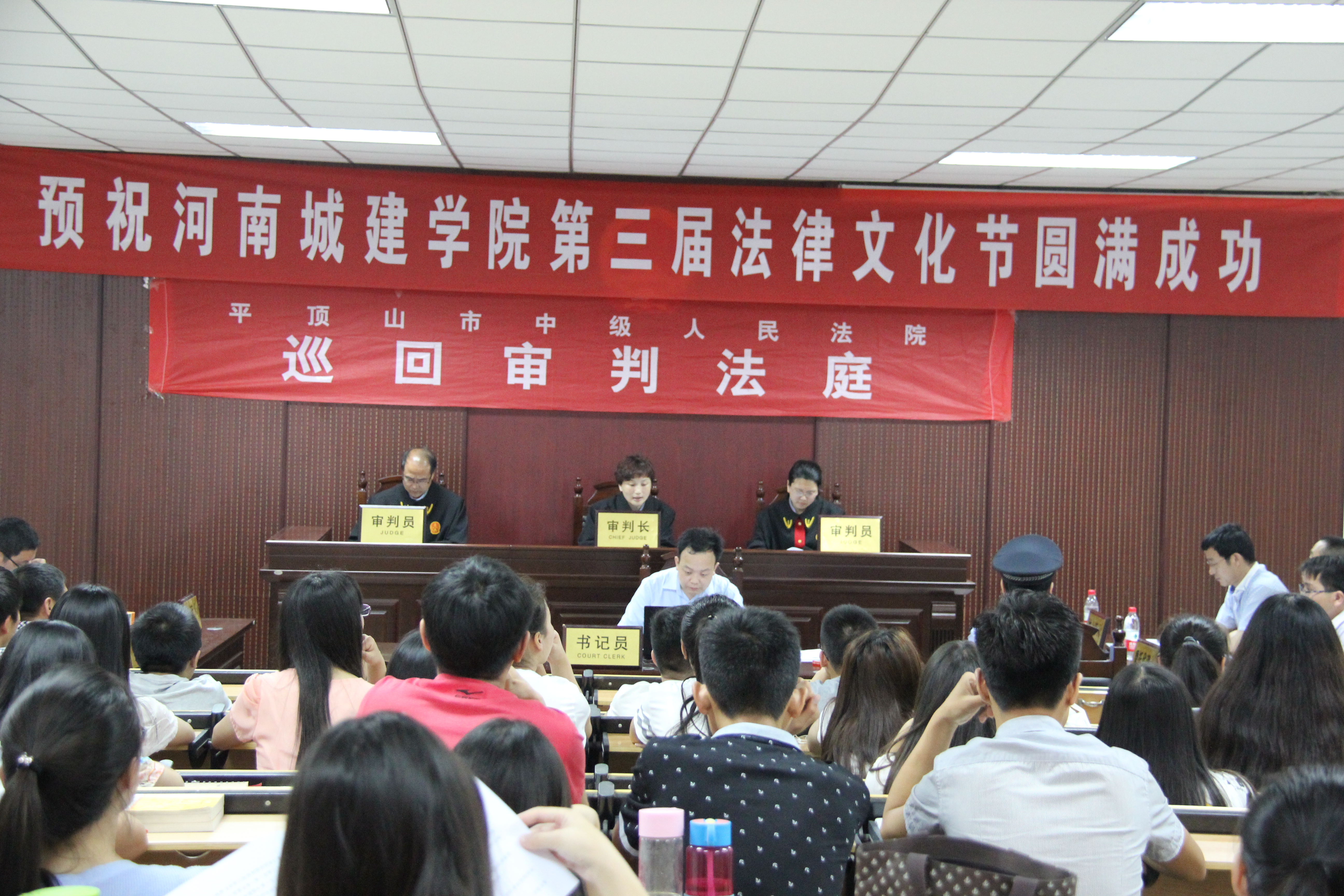 (通讯员 张强)为丰富我校第三届法律文化节活动,切实有效地开展法治宣传教育,5月25日上午,平顶山市中级人民法院民一庭副庭长盛华平法官一行7人应邀走进我校,在文学院模拟法庭开展“庭审进校园”活动,就平顶山市石龙区农村信用合作联社与魏军民、樊延德金融借款合同纠纷上诉一案进行巡回法庭审理。我校师生200余人在yl6809永利官网集团院长王艳芳的带领下观摩了本次庭审。