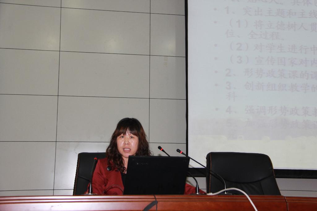 思想政治教育教学部王巧慧博士传达了教育部和省形势与政策教育教学培训会精神,并谈了学习体会;陈振国博士就中美关系问题做了专题辅导报告。