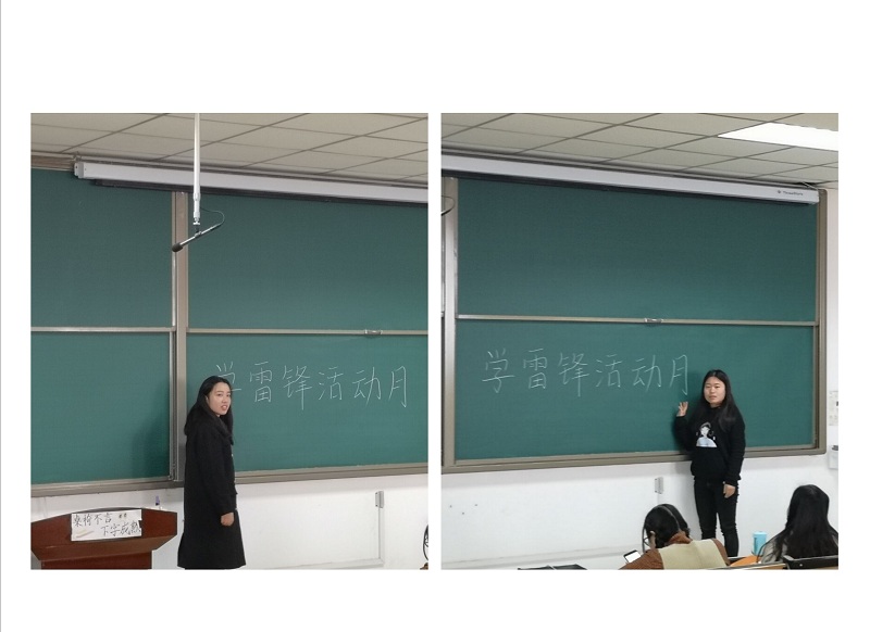 团支书何欣霏和安帅鑫分别向大家介绍了雷锋的光荣事迹以及学习雷锋精神的重要意义。冯敏和高馨同学讲述了雷锋日记的内容,雷锋日记始终鼓舞着我们前进,人的思想要经常检查才不会出毛病,我们要不断地加强学习提高自己的思想觉悟,经常开展批评与自我批评,随时清除思想上的毛病。同时分享了雷锋同志的人生格言,给大家留下了一笔宝贵的精神财富,激励着同学们发扬奉献精神,倡导文明新风。