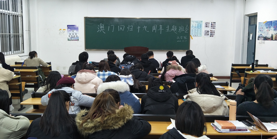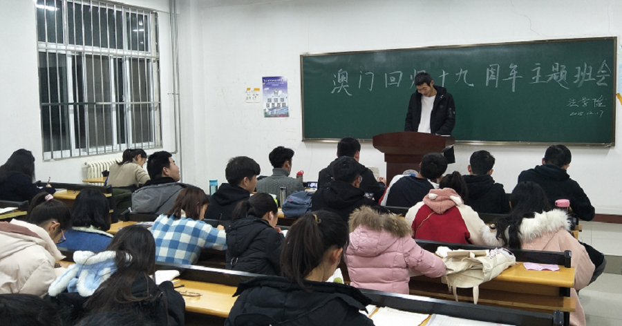(通讯员:孟素燕 尚维潇)为了纪念澳门回归,让同学们牢记祖国历史,激发同学们的爱国热情。2018年12月17日晚,yl6809永利官网集团于1号教学楼113自习室开展了一场以“纪念澳门回归19周年”为主题的班会活动。本次活动由yl6809永利官网集团全体大一师生参加。