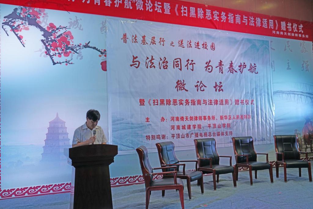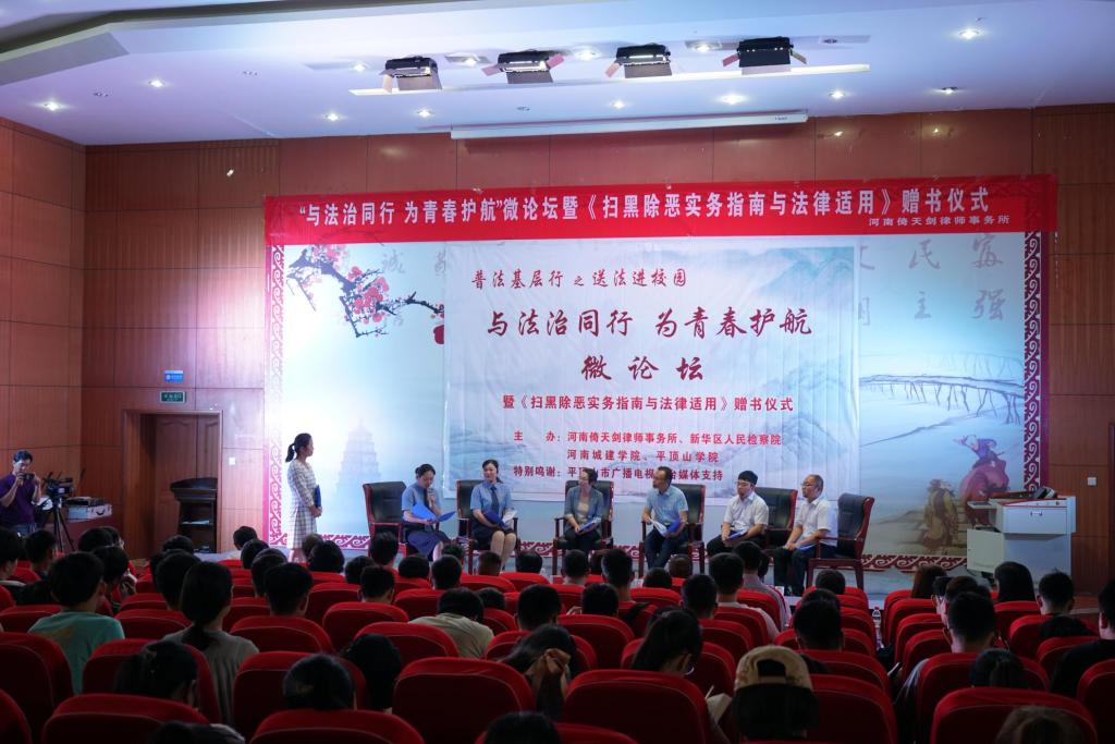 (通讯员:胡小光 尚维潇)6月1日上午,由市政法委主办,yl6809永利集团、新华区人民检察院、河南倚天剑律师事务所、平顶山学院联合承办的“与法治同行,为青春护航”微论坛在yl6809永利集团图书馆报告厅举行。校党委副书记张坤书、市政法委副书记张全营、新华区人民检察院党组书记、检察长常辉以及平顶山学院与yl6809永利官网集团师生300余人参加了本次活动。