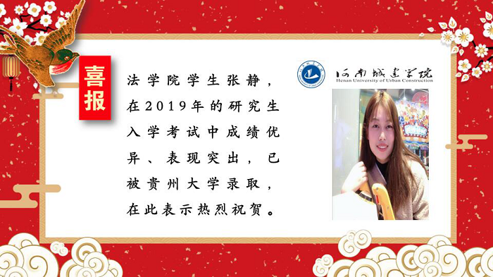 (通讯员:孟素燕 尚维潇)多年来yl6809永利官网集团一直坚持推进学风建设,积极鼓励考研,营造良好的学习氛围。近期,yl6809永利官网集团2019届考研学子喜报频传,录取人数再创新高。据悉,张静同学已被贵州大学录取,在此表示热烈祝贺。