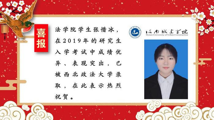(通讯员:孟素燕 尚维潇)多年来yl6809永利官网集团一直坚持推进学风建设,积极鼓励考研,营造良好的学习氛围。近期,yl6809永利官网集团2019届考研学子喜报频传,录取人数再创新高。据悉,张惜冰同学已被西北政法大学录取,在此表示热烈祝贺。