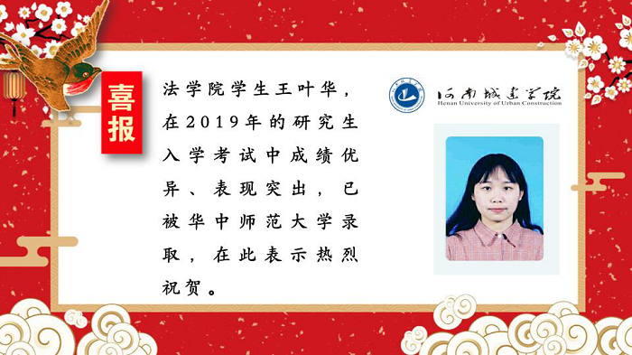 (通讯员:孟素燕 尚维潇)多年来yl6809永利官网集团一直坚持推进学风建设,积极鼓励考研,营造良好的学习氛围。近期,yl6809永利官网集团2019届考研学子喜报频传,录取人数再创新高。据悉,王叶华同学已被华中师范大学录取,在此表示热烈祝贺。