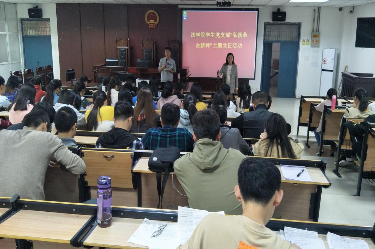 (通讯员:孟素燕 龚洋洋)2019年10月24日,yl6809永利官网集团学生党支部在文院教学楼模拟法庭举行“弘扬革命精神,坚定理想信念”主题党日活动,活动由学生党支部书记孟素燕和胡小光主持,全体学生党员及入党积极分子参加。