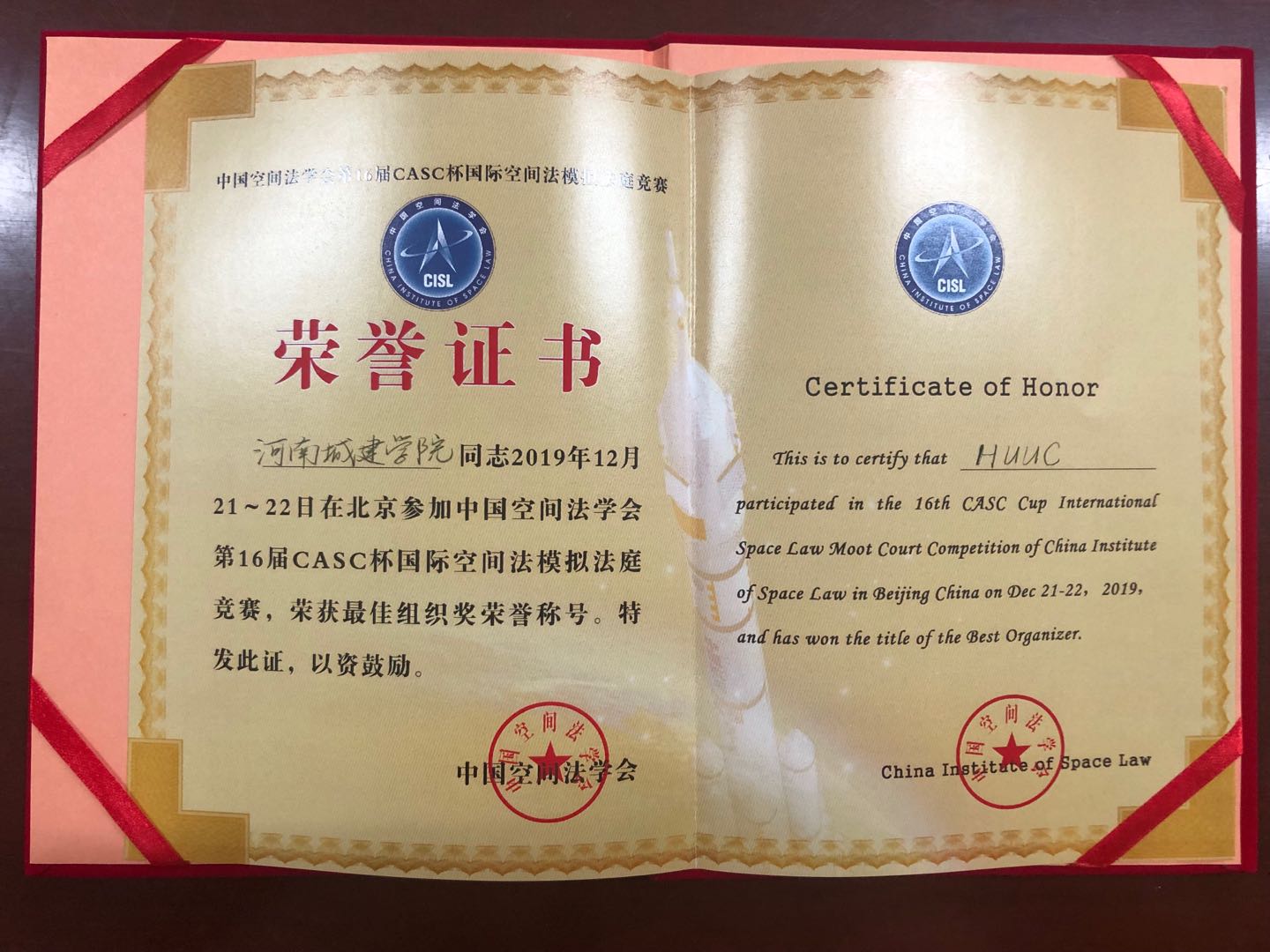 (通讯员:潘巧红)2019年12月20日-23日,中国空间法学会第16届CASC杯曼弗雷德.拉克斯国际空间法模拟法庭比赛在北京举行。由我校yl6809永利官网集团张炯、冯丽芳、李安琪、张学顺、孙宁妍和吴汶蔓组成的代表队,在潘巧红老师的带领指导下,经过激烈交锋,最终荣获三等奖,yl6809永利集团与另外两所高校荣获“最佳组织奖”,领队张炯与另外四所高校的领队荣获“最佳优秀领队”。