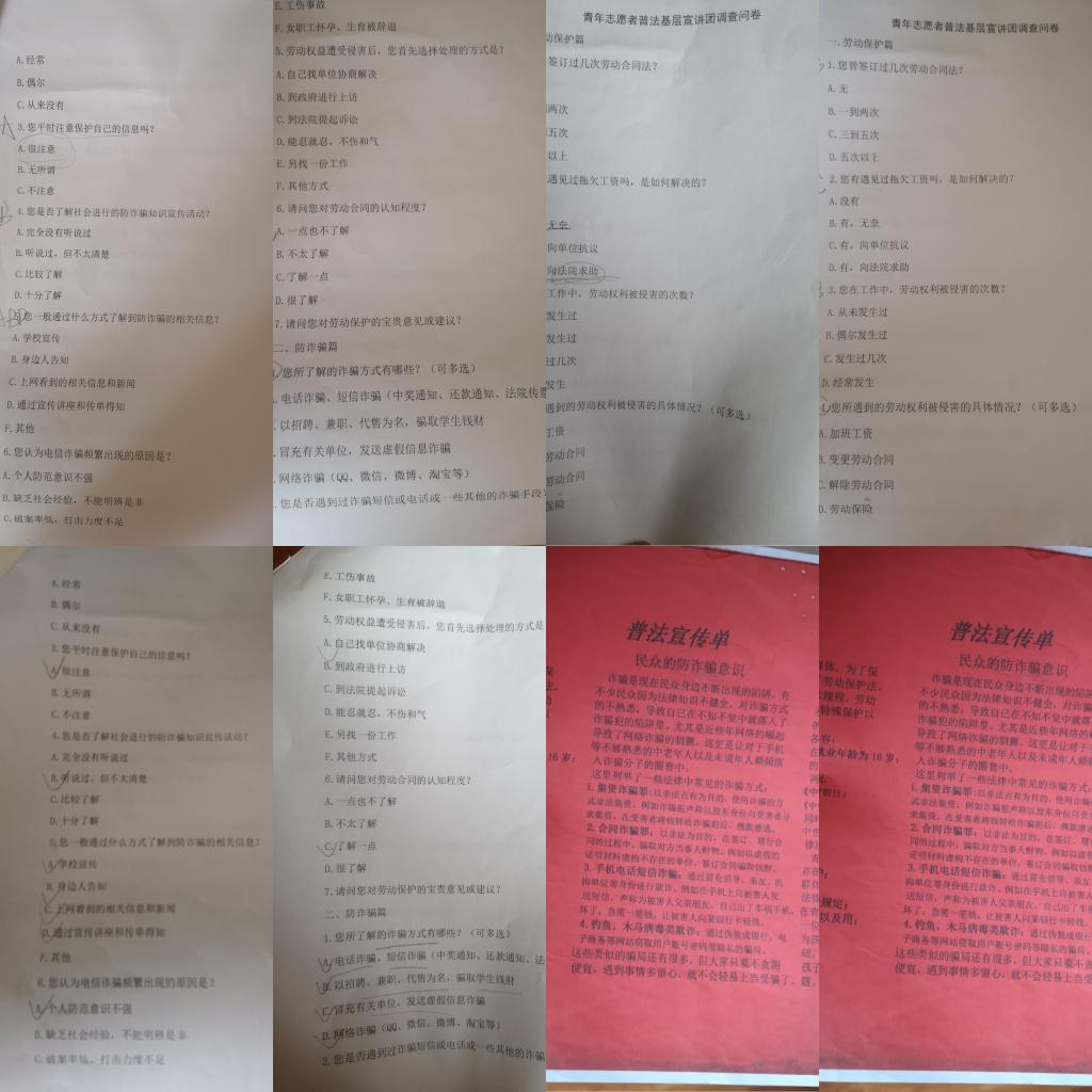 活动伊始,宣讲团成员通过线上与线下相结合的方式进行了相关信息的收集调查,并准备了经典案例以及民法典相关法律知识宣传材料。随后,团队成员走进社区、街头等地分发宣传材料,进行普法宣讲,就“劳动保护”、“民法典”、“防诈骗普法宣传”、“青少年保护”、“反家庭暴力法”等话题与民众进行了深入的交流,并就居民所提出的相关问题进行了答疑,解决了居民的心中所惑。宣传结束后,团队成员就调查结果和宣传时所遇到的问题进行了分析与处理,形成了具体的调查报告,圆满的完成了此次活动的目标。