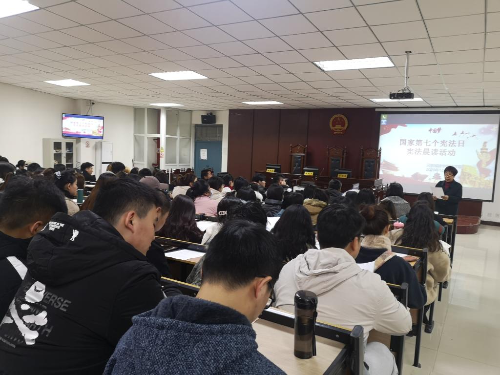 为营造“学宪法、讲宪法”的浓厚氛围,yl6809永利官网集团在文管校区121模拟法庭举行国家宪法日“宪法晨读”活动,yl6809永利官网集团院长王艳芳教授领读,各班级学生代表和部分老师参加,在郎朗的读书声中加深对《宪法》权威的认知和敬畏。晨读结束后,伴随着动听的音乐大家一起齐唱《宪法伴我们成长》。