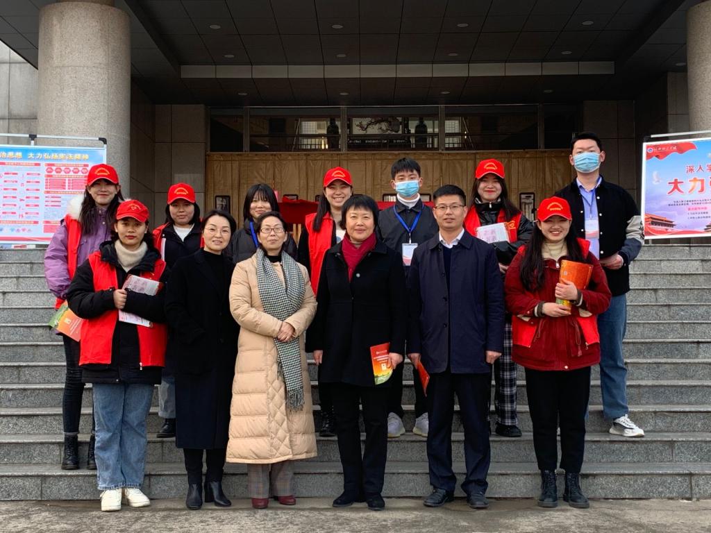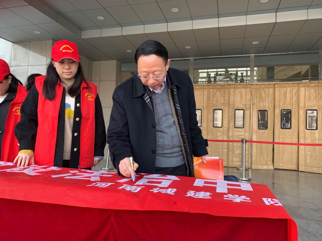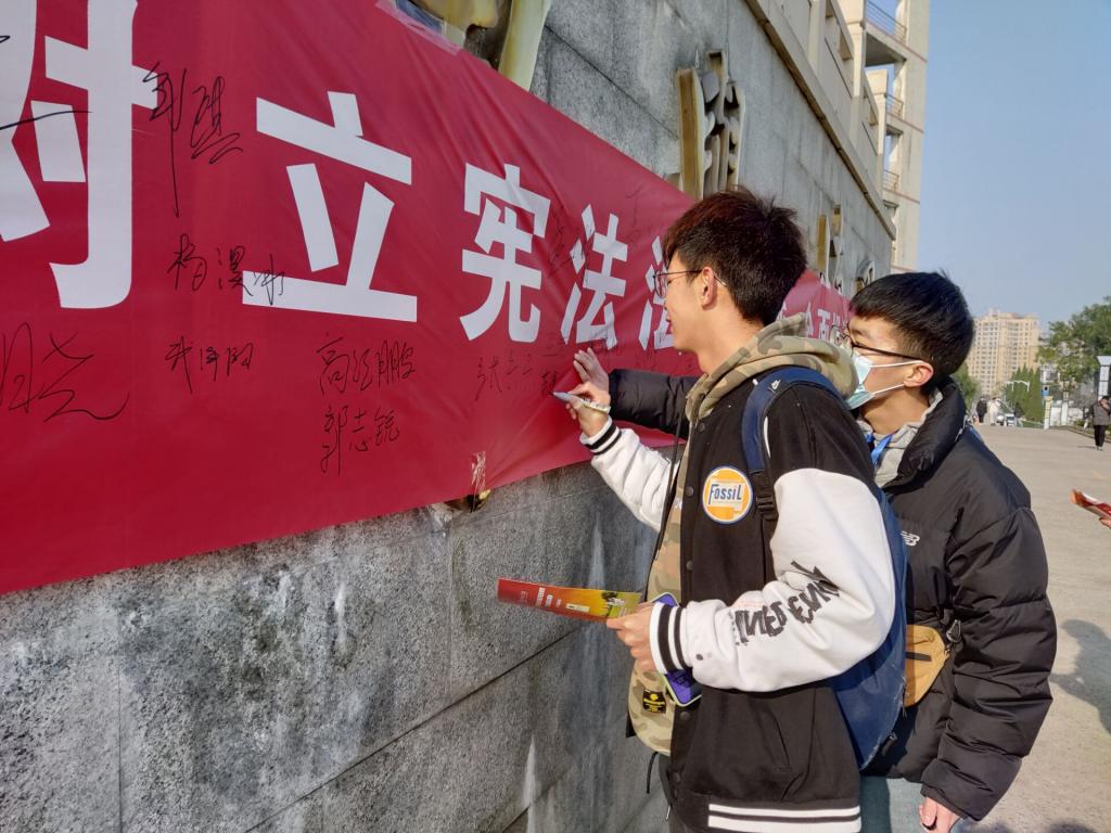 在理工校区行政楼前、图书馆广场,yl6809永利官网集团30余名师生发放宪法、民法典宣传页,设置版面、张贴横幅,积极开展普法活动,校党委书记张惠贞亲临宣传现场,并参加“学习宪法万人签名”活动。