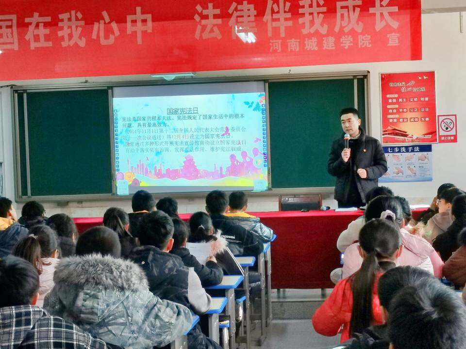 在汝州市米庙镇第一初级中学,我校刘宏伟老师一行10余名人带领中学生们齐声进行宪法晨读,营造浓厚的法律宣传氛围,刘宏伟还为中学生们上了一节精彩的宪法课,同学们听得津津有味,课后还进行了宪法小测试;在课程结束之后,我校师生还与中学生们交谈心得感悟,使他们在浓厚的宪法学习中受到熏陶、感染,增强了法治意识。