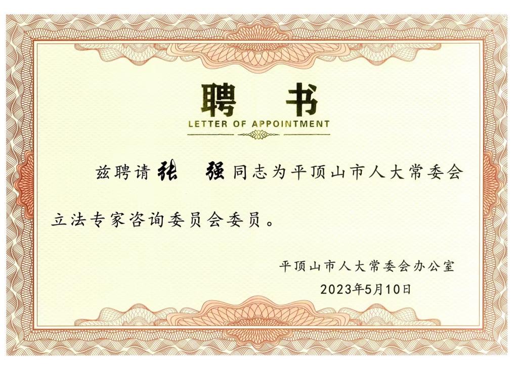 会上,张强被聘任为平顶山市人大常委会立法咨询专家委员会委员。