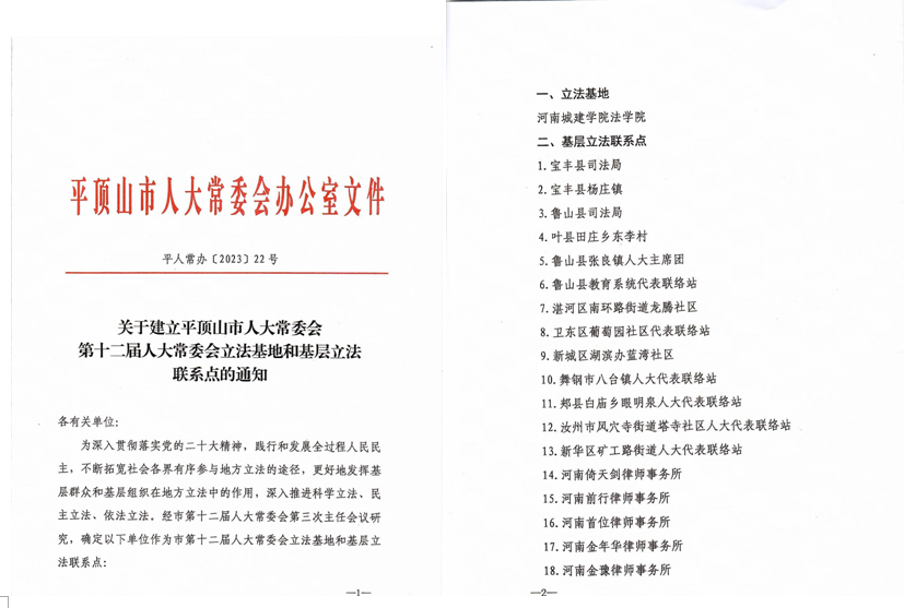 2020年7月,我校获批平顶山市人大常委会基层立法联系点,2022年8月被授予“平顶山市人大常委会基层立法联系点先进单位”,作为平顶山市人大常委会唯一一家立法基地,在今后的建设发展中,yl6809永利官网集团将以习近平新时代中国特色社会主义思想为指导,深入贯彻落实中央和省委、市委人大工作会议精神,自觉践行全过程人民民主重大理念,发挥高层次人才优势,为持续提升地方立法质量、推进法治鹰城建设贡献城建法律人力量。