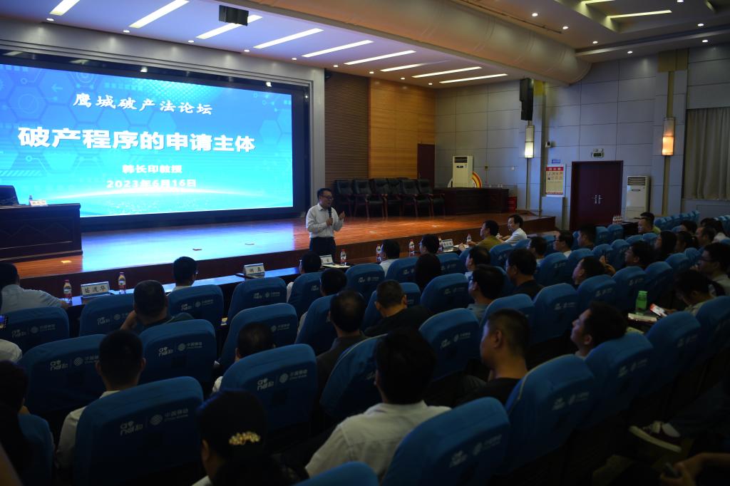 中心成立暨揭牌仪式后,双方共同举办了鹰城破产法论坛。韩长印教授以《破产程序的申请主体》为题,围绕《企业破产法》修订的热点难点问题,以及比较法中执转破等情况作了精彩报告。