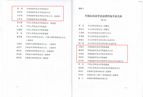 为深入学习贯彻习近平法治思想,弘扬社会主义法治精神,充分发挥法学会“智囊团”“思想库”“人才库”作用,更好服务平安鹰城、法治鹰城建设,平顶山市法学会统筹全市法学法律资源,组建法律咨询专家库。经单位推荐、资格初审、专家评审,市委政法委批准,我院九位教师获聘平顶山市法学会(首席)法律咨询专家。