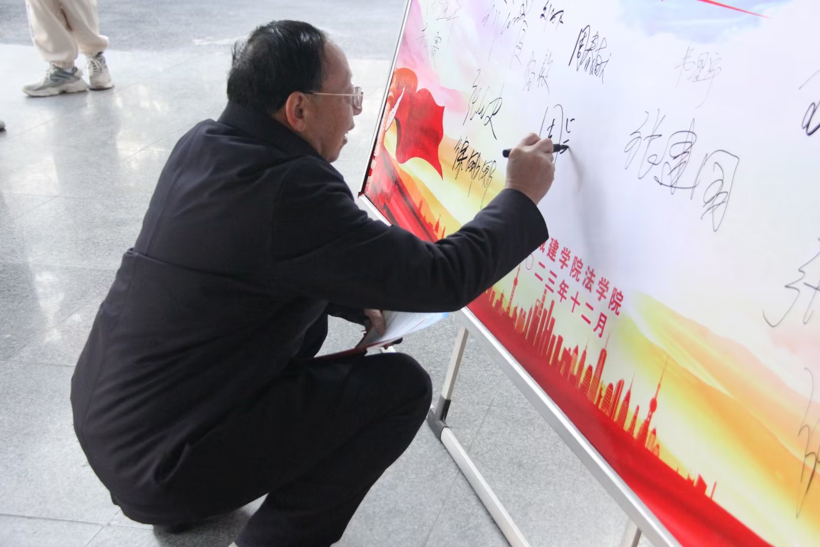 在校内,早上7点多,志愿者们在和谐校区与龙翔校区同步开展宣传活动,他们悬挂宣传条幅、摆放宣传展板、向师生发放宪法伴我成长宣传册、感受宪法精神主题签名,并开展法律咨询服务活动。上午九点三十五分,学校在yl6809永利官网集团设立学校参与主会场,校党委副书记王靖、校党委委员、宣传部部长张建国以及yl6809永利官网集团师生代表一起参加教育部举办的教育系统“宪法晨读”活动。伴随着庄严的国歌后,宪法晨读活动正式开始,与会师生共同跟随主会场跟读宪法部分条款,声音整齐响亮、铿锵有力,在重温宪法条款的同时,感受宪法的神圣和庄严。