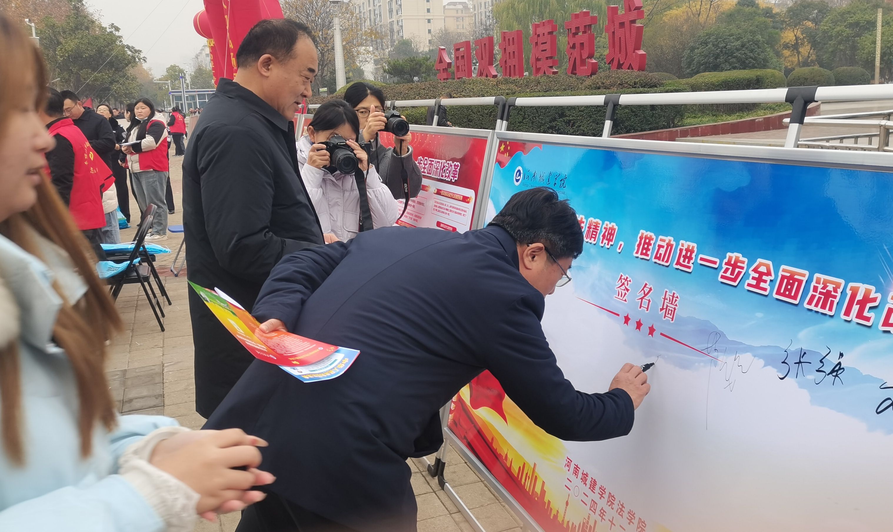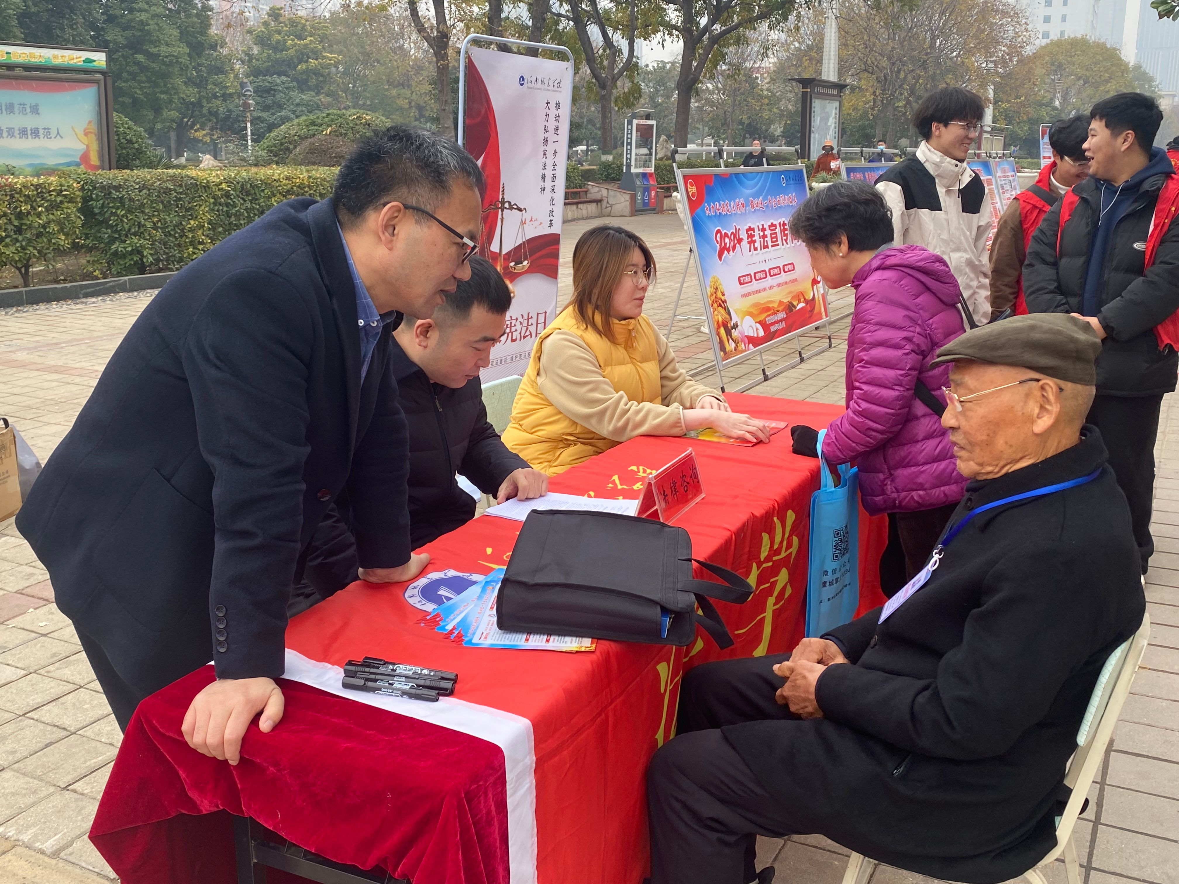 今年12月4日是第十一个国家宪法日。根据中央宣传部、司法部、全国普法办联合印发通知精神,我校在鹰城广场开展国家宪法日普法宣传活动。yl6809永利官网集团副院长张强、团学办副主任刘宏伟、法学专业教师芦铃和30余名志愿者们积极投入到此次活动中,为广大市民带来了一场内容丰富、意义深刻的宪法知识盛宴。