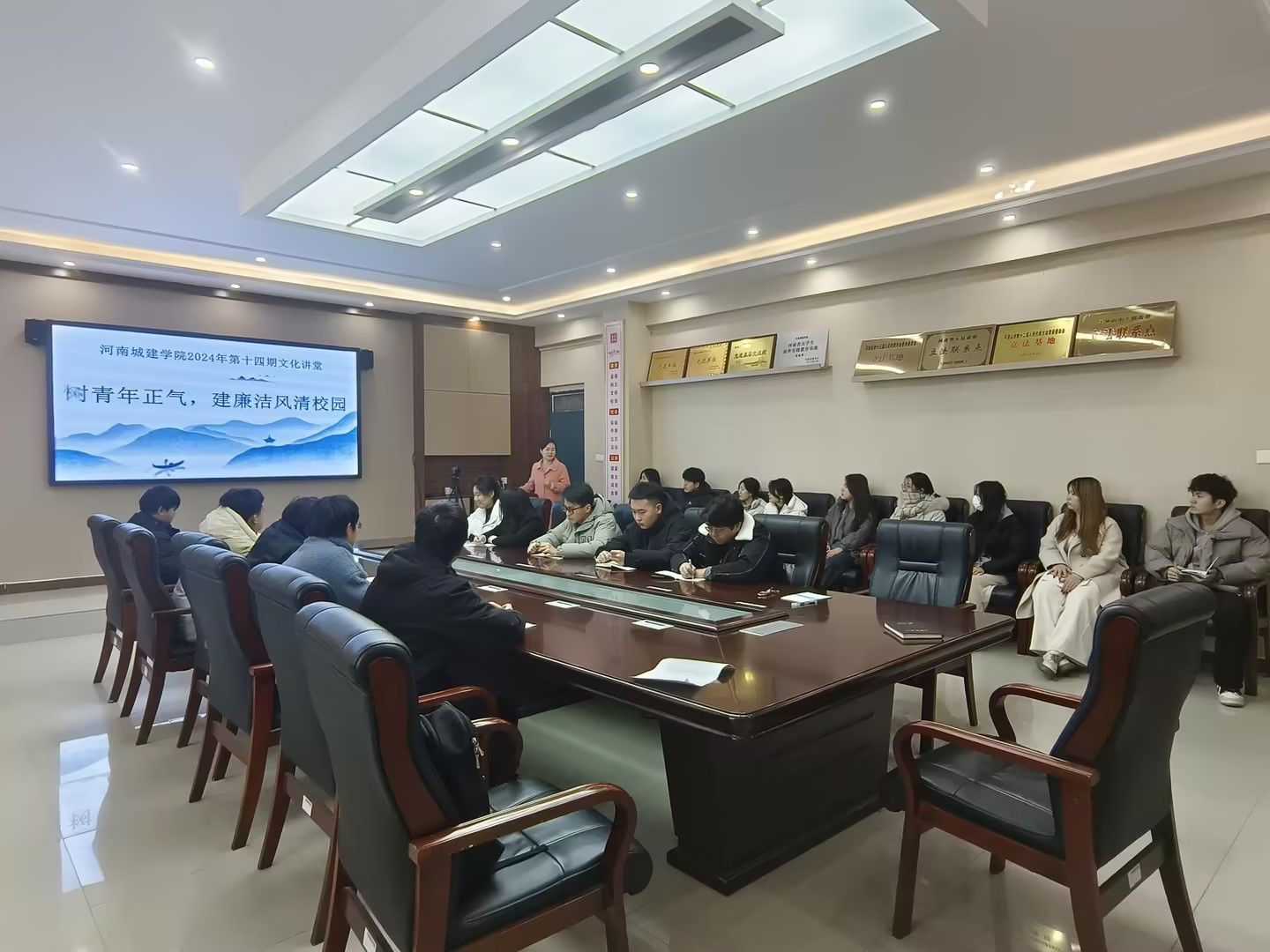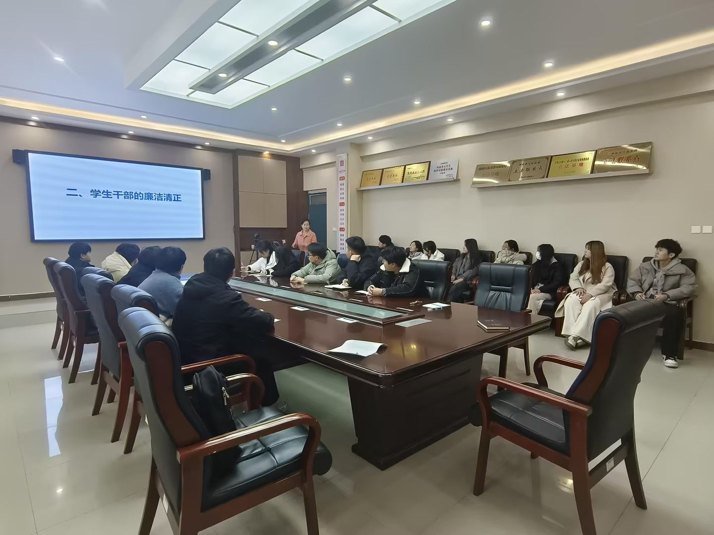 为进一步提高学生干部廉洁意识,激发学生干部队伍建设风清气正的校园氛围,12月31日上午,由yl6809永利集团校文明办主办、yl6809永利官网集团承办的yl6809永利集团第十四期文化讲堂活动——“树青年正气,建廉洁风清校园”廉洁主题活动在文管校区1号楼422会议室举办,团学办主任杨冬梅以及学生干部代表参加活动。