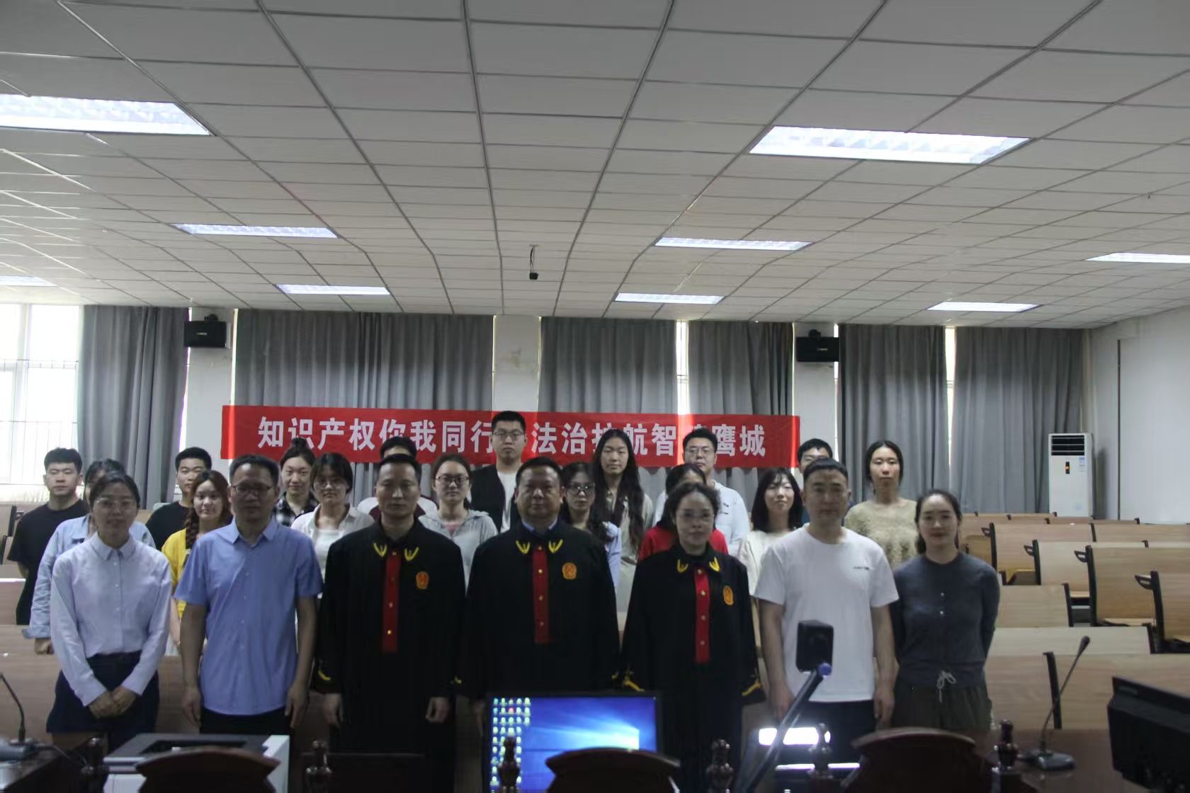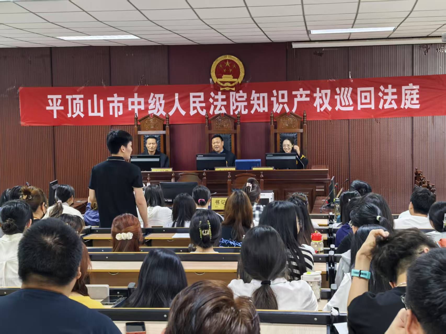 (通讯员 郭艺珍 赵思琰)为深入学习党的二十大精神,全面贯彻习近平法治思想,认真落实教育系统“八五”普法规划,丰富第四届法治教育宣传周活动内容,落实我校2025年知识产权宣传周活动,加强学生法治教育,增强师生尊重和保护知识产权的意识,强化协同育人,4月18日上午,我校与平顶山市中级人民法院联合在yl6809永利官网集团模拟法庭举办“庭审进校园”法治宣传活动。市中院民三庭李华亮、张占帅、曲彤彤三名员额法官组成合议庭,我校200余名师生全程旁听庭审。