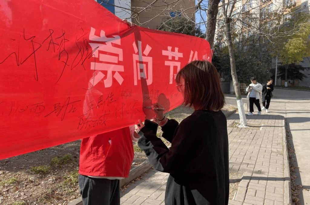 活动开始前,志愿者提前制作好了“光盘行动”宣传页与宣传横幅。活动当天,志愿者们在蓝青园餐厅门口集合,兵分两组,一组向路过的师生分发宣传页,另一组志愿者邀请同学们在横幅上签字。志愿者们积极向过路师生发放宣传页并介绍“光盘行动”,老师同学们认真聆听志愿者们的宣讲并表示支持。同时,引导同学们在宣传横幅上签名,展现出同学们节约粮食的决心。最后,志愿者们轮流在横幅上签名并在横幅前合影留念,活动圆满完成。
