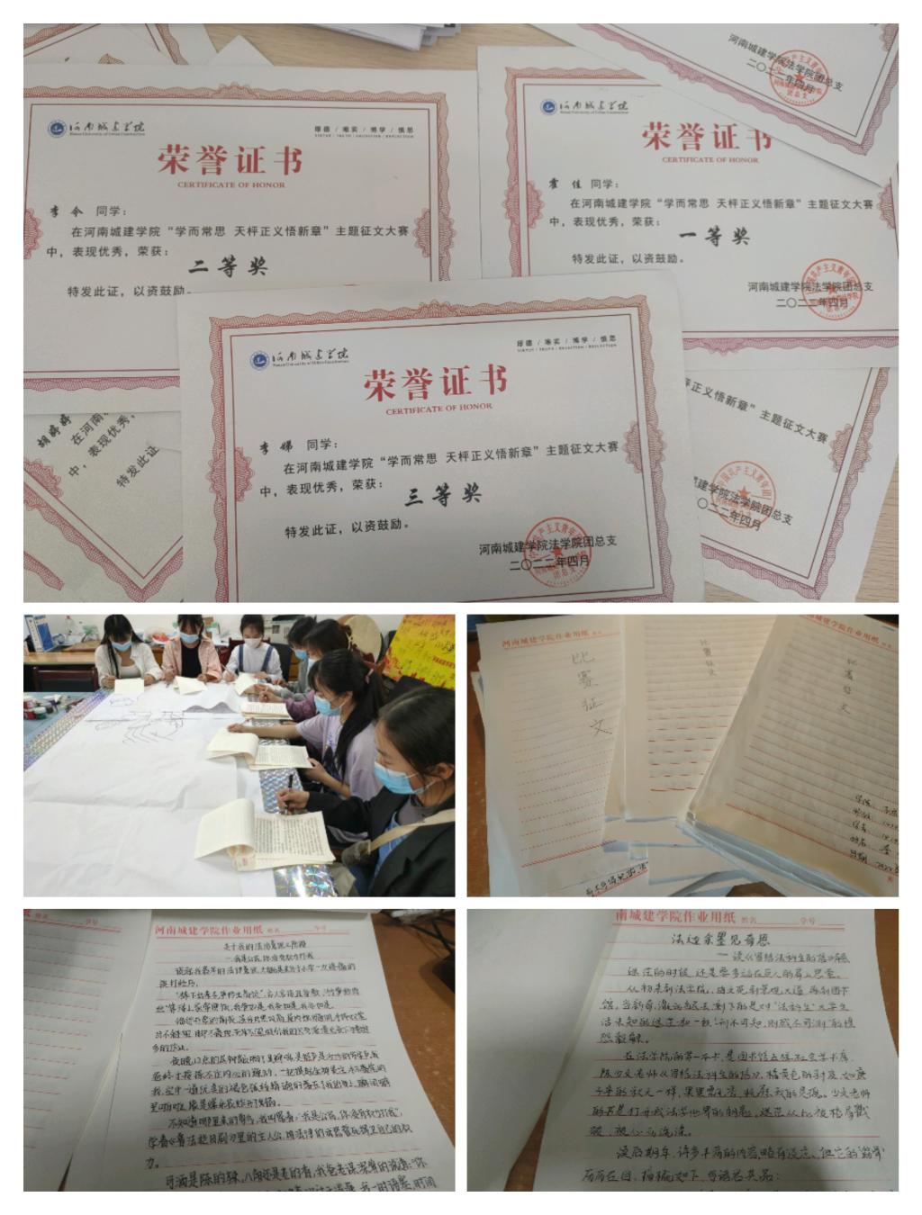 参赛同学根据大赛主题,在“法边余墨见奇思”、“我与法律有个约会”、“法治在我心中”三个题目中任选其一参赛。经过广泛宣传动员,征文活动共收到63份作品。经过评委认真评审,霍佳、曾小骞、王镇旗获得一等奖,周怡心、李今、徐施楠、胡婷婷获得二等奖、李娣、张桂萍、王莹莹、时秋歌、张甜甜获得三等奖。