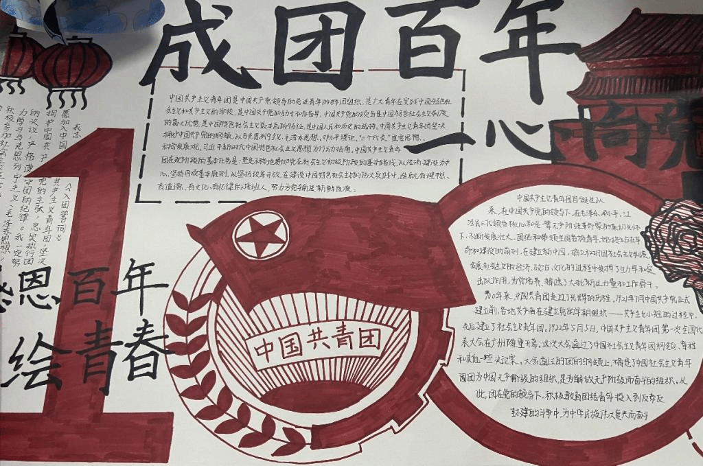 本次比赛以个人为单位,由各参赛者自备材料,围绕主题精心设计手抄报版面。同学们积极参与,创作出了一幅幅内容丰富、形式多样的优秀作品,用绘画来为建团百年献礼。经过评委评选,最终选出一等奖1名、二等奖3名、三等奖5名。此次手抄报比赛激发了团员青年对共青团真挚而热爱的情感。