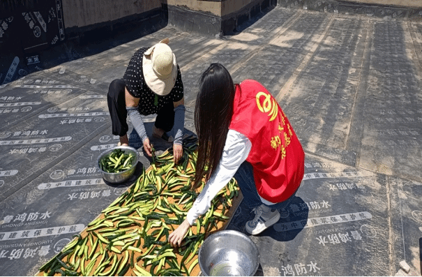图为帮扶团成员帮老人晒咸菜