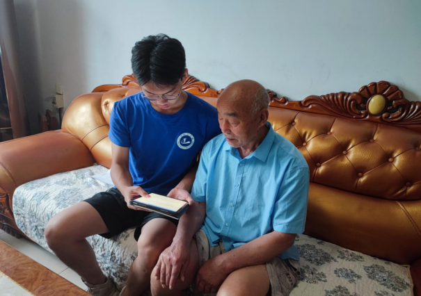 图为帮扶团成员对老人进行采访调查