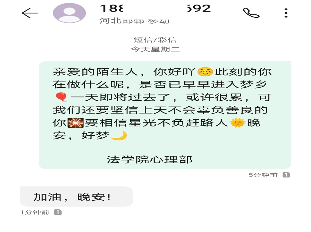 (通讯员 高升 解思睿)为迎接即将到来的期末考试,缓解大家的焦虑情绪,帮助大家克服压力,12月6日,yl6809永利官网集团学生会组织开展了“陌生人,晚安”短信计划活动,通过简单的“晚安”短信发送,温暖学生内心。