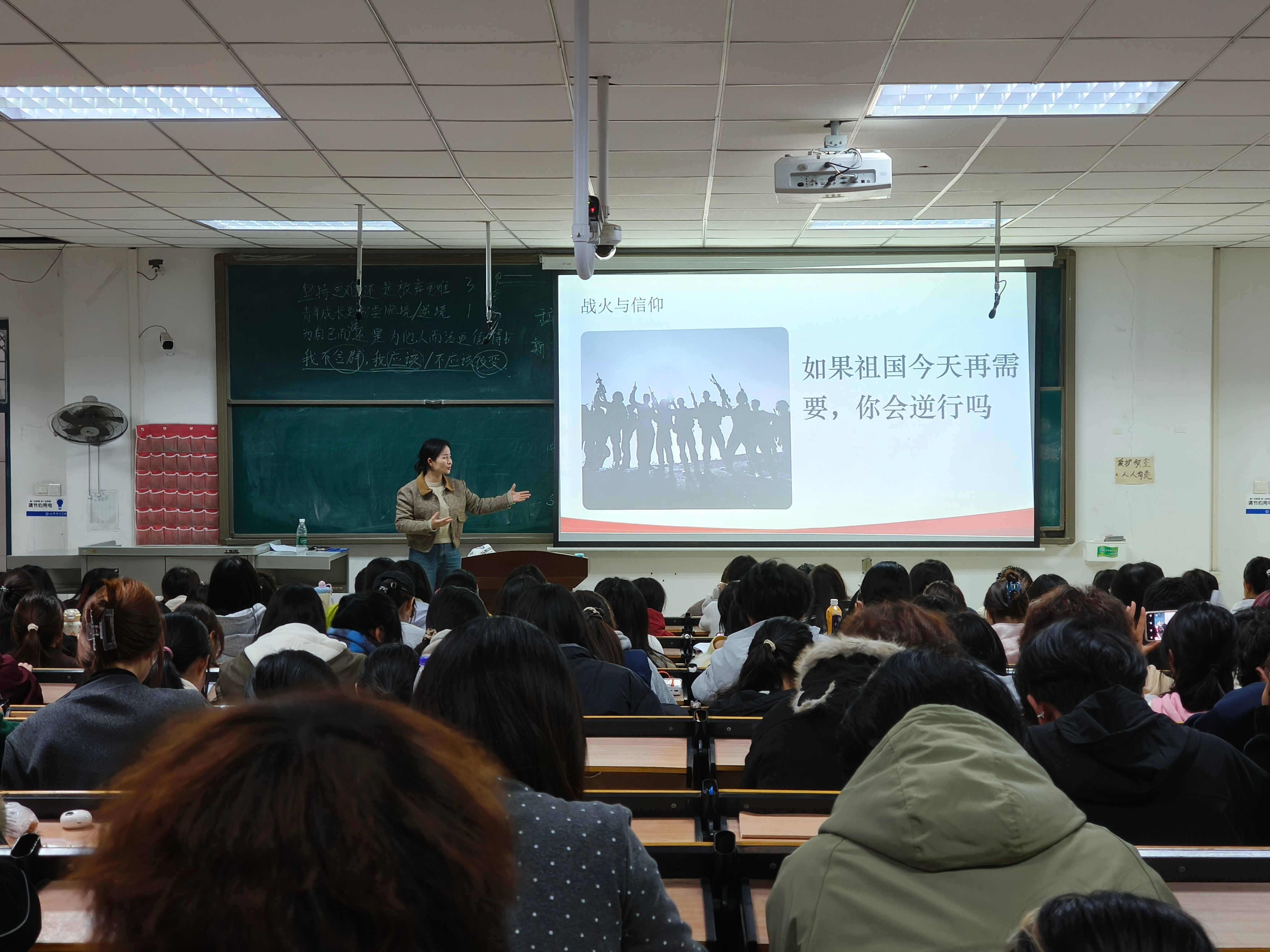 团课在《中国人民志愿军战歌》中拉开帷幕。杨冬梅老师以《从抗美援朝精神中汲取奋进力量》为题,从战争背景、英雄事迹、时代价值三个维度展开讲授。她结合珍贵档案与影像资料,回顾了志愿军将士“钢少气多”战胜“钢多气少”的壮烈历程,深刻阐释了抗美援朝“爱国主义精神、革命英雄主义精神、革命乐观主义精神、革命忠诚精神与国际主义精神”的丰富内涵。杨冬梅老师指出,75年后的今天,世界百年未有之大变局加速演进,青年学子更需筑牢信仰之基,把个人“小我”融入祖国“大我”,在新时代征程中续写“英雄赞歌”。授课尾声,她带领全体团员重温入团誓词,铿锵誓言响彻会场。
