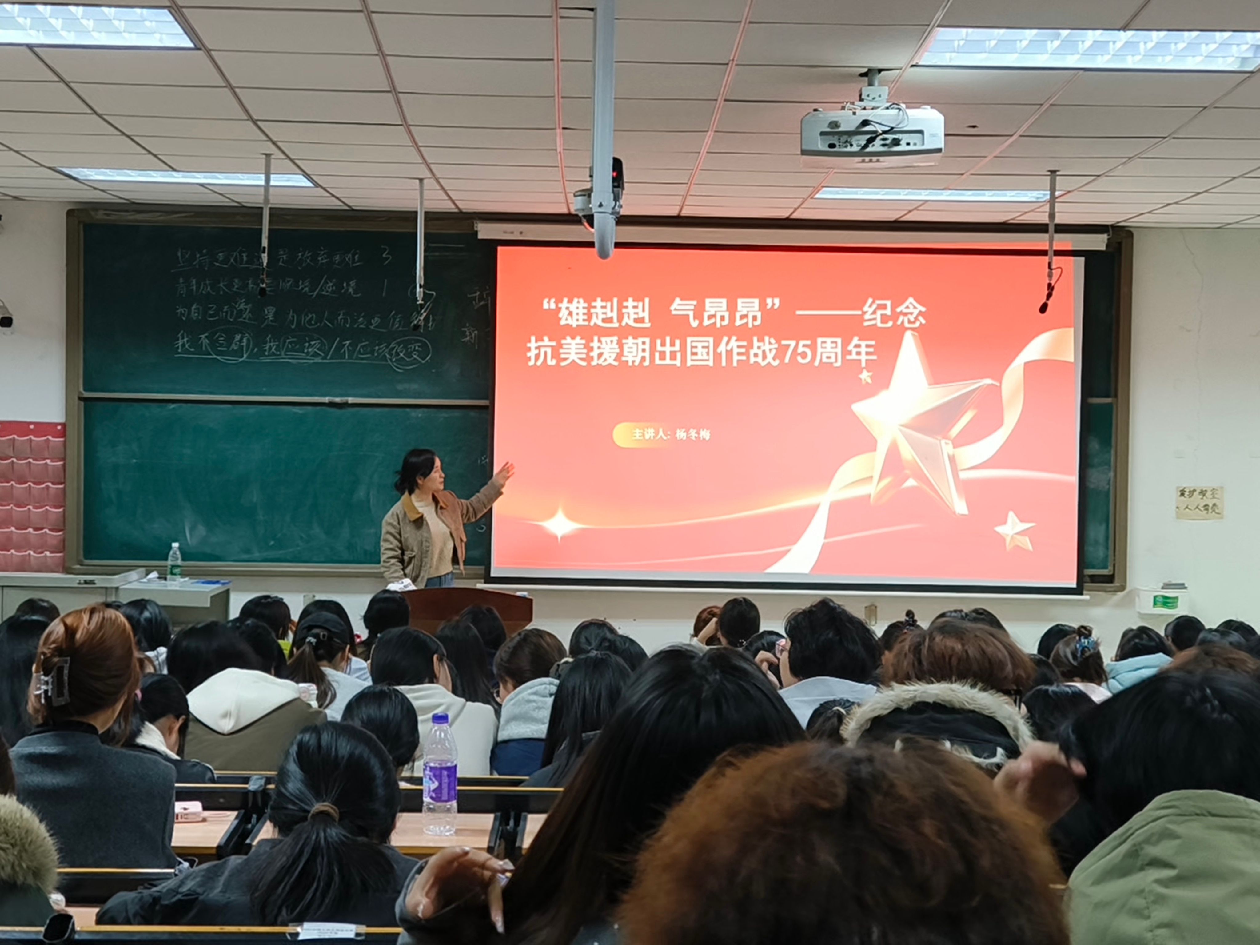 为纪念中国人民志愿军抗美援朝出国作战75周年,10月27日晚,yl6809永利官网集团团委在1#228教室举办“铭记抗美援朝历史 弘扬爱国主义精神”主题团课,yl6809永利官网集团团学办主任杨冬梅老师做专题报告,yl6809永利官网集团团员青年100余人参加活动。