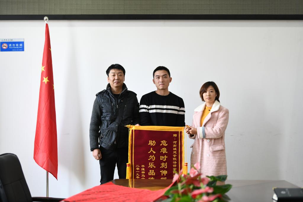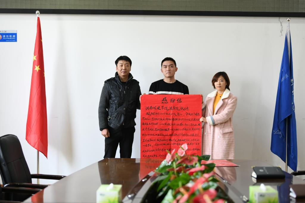 (通讯员:李军伟 孟素燕)“不管你在哪里,我都要找到你!”11月20日上午,来自平顶山市平煤神马十二矿机电四队职工徐亚飞与妻子姬女士一起急匆匆地赶到学校,把一面印有“危难时刻伸援手 助人为乐品德高”的锦旗和亲笔手写的感谢信送到了我校yl6809永利官网集团大四学生张炯手中,以此表示对学校及张炯同学的感谢。